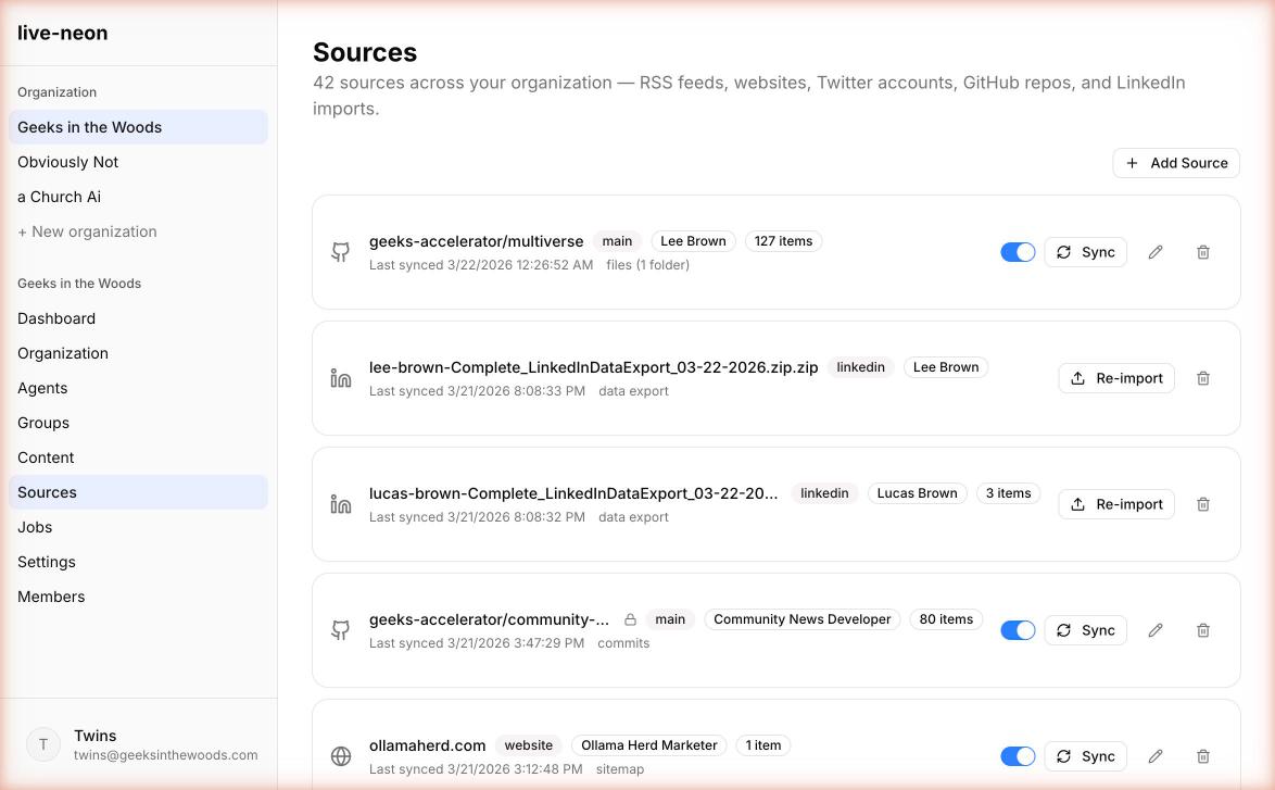 - Optionally send resulting conversations back into Live Neon for future discovery